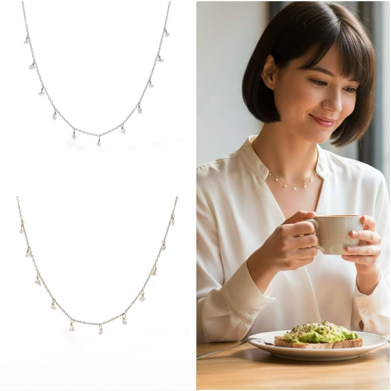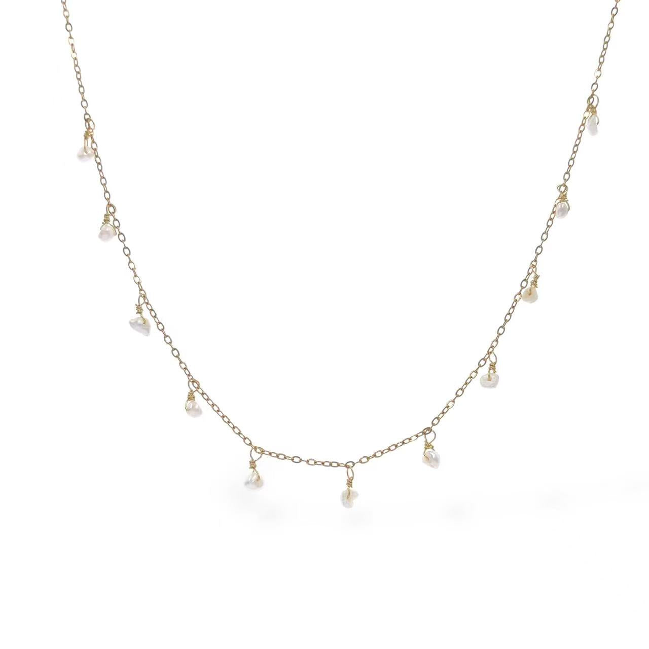 Lunga 38cm + 5cm regolabili, è composta in acciaio inossidabile e variante placcata in oro, le perline sono perle naturali